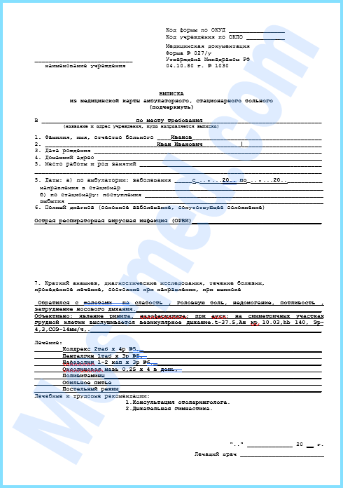 Стационарная форма документа выдается пациентам, проходившим лечение в больнице. Информация в ней содержится примерно та же. Но каждый из документов должен оформляться в соответствии с определенными требованиями.